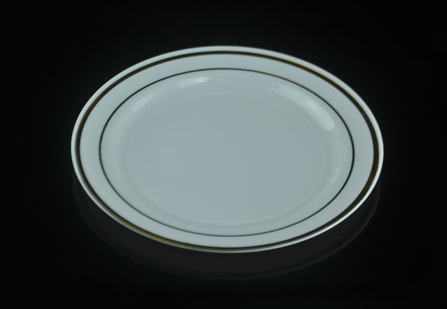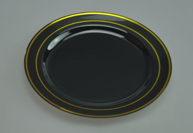 The heavy weight black plastic plates are made from polystyrene(PS) and with two lines of golden bands, looks like real fine chinaware. The splendid plastic plates combine the conveniences of plastic with the elegant appeal of china. They are ideal for serving entrees, desserts, side dishes, salads, appetizers etc in catered events, parties, receptions and so on. The heavy duty dishes can be reused for many times though they still disposable for easy clean-up. They are recyclable and environmental friendly.